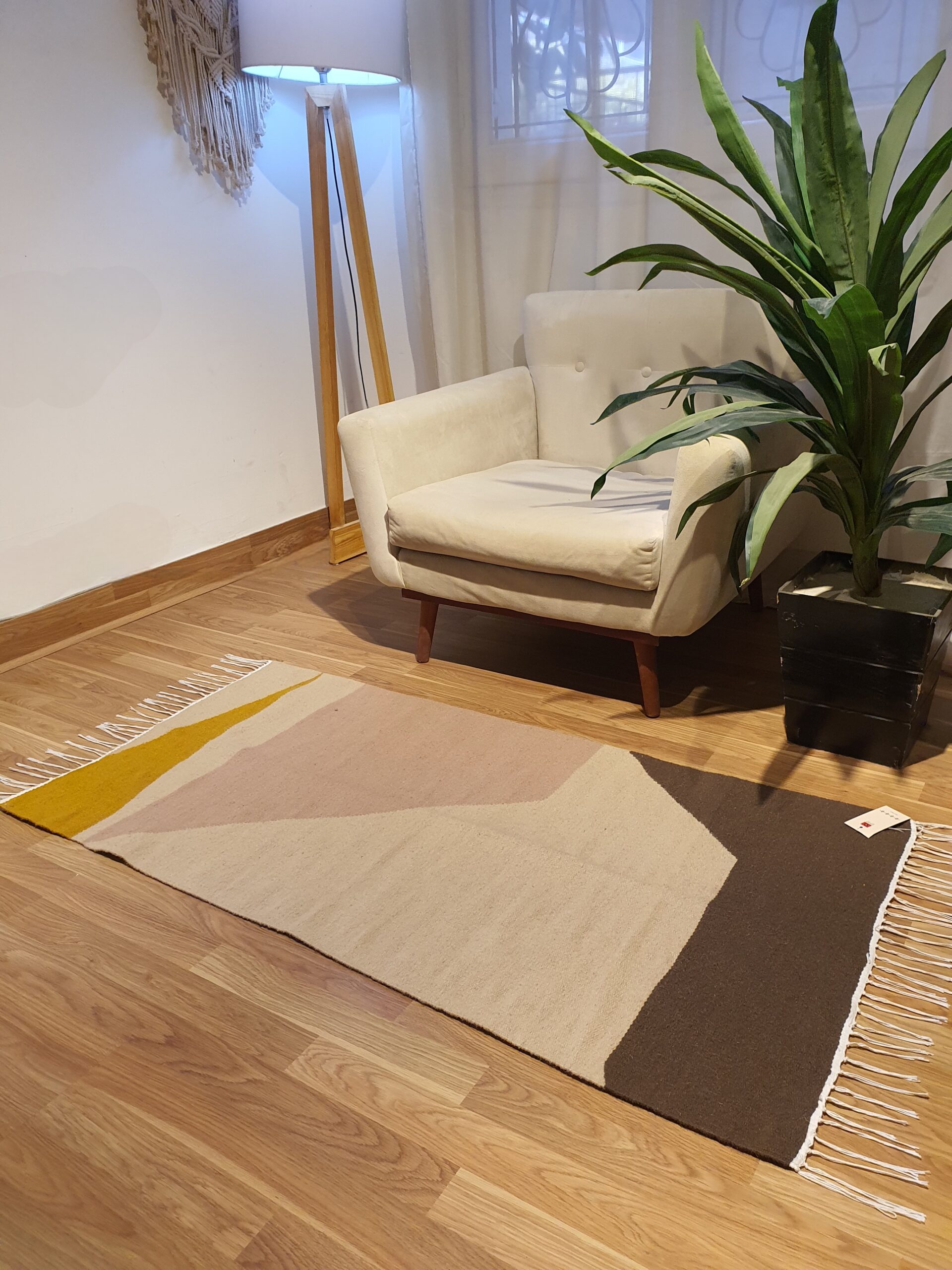 Be the first to review “Handmade Modern Dark Brown, Gray-Brown, and Mustard Yellow Kilim”